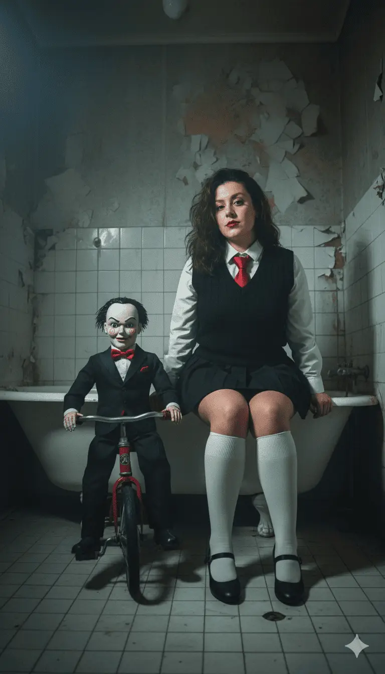 Crie uma imagem em clima sombrio e assustador, com estética de filme de terror. Mostre uma jovem vestida com um uniforme escolar: camisa branca, colete preto, saia plissada preta, meias brancas até o joelho, sapatos pretos de salto e uma gravata vermelha. Ela está sentada na beira de uma banheira antiga com pés de garra, dentro de um banheiro envelhecido e mal conservado, com pintura descascando nas paredes e iluminação fraca. Ao lado dela, há um boneco de ventríloquo sinistro, semelhante ao Billy do filme “Jogos Mortais”, usando um terno com gravata borboleta vermelha, montado sobre um pequeno triciclo vermelho. A cena transmite uma atmosfera escura, perturbadora e cinematográfica, típica de um filme de terror psicológico.
